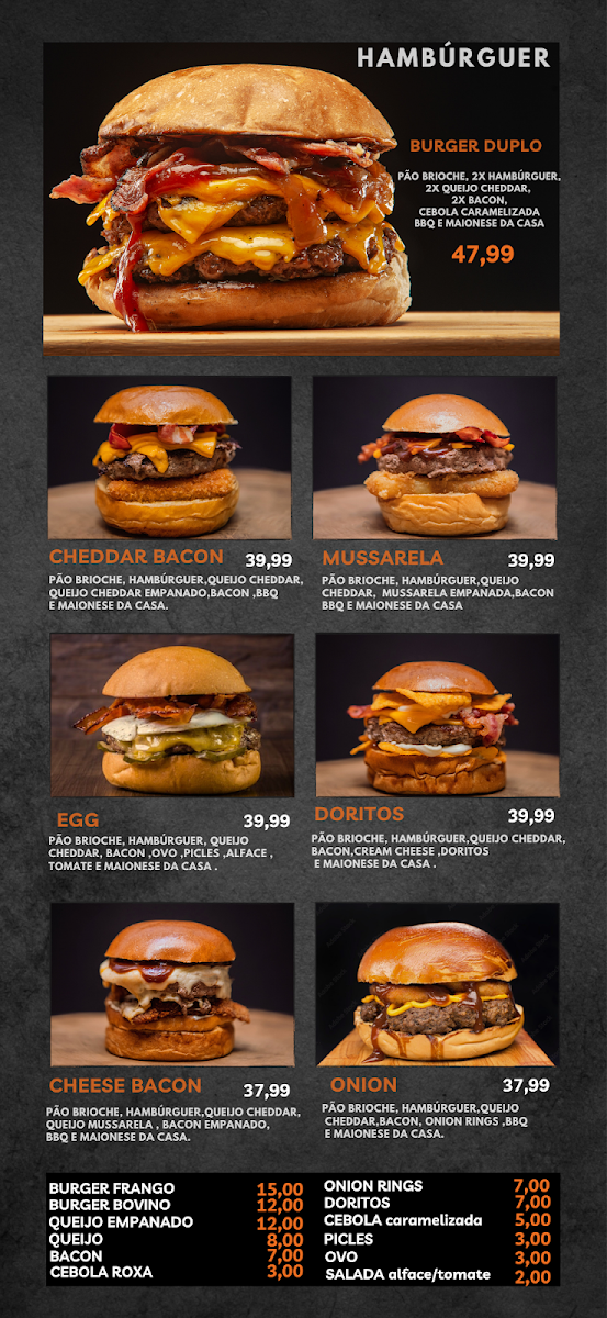 Pão brioche, hamburguer, queijo, cheddar, bacon, ovo, picles, alface, tomate e maionese da casa.