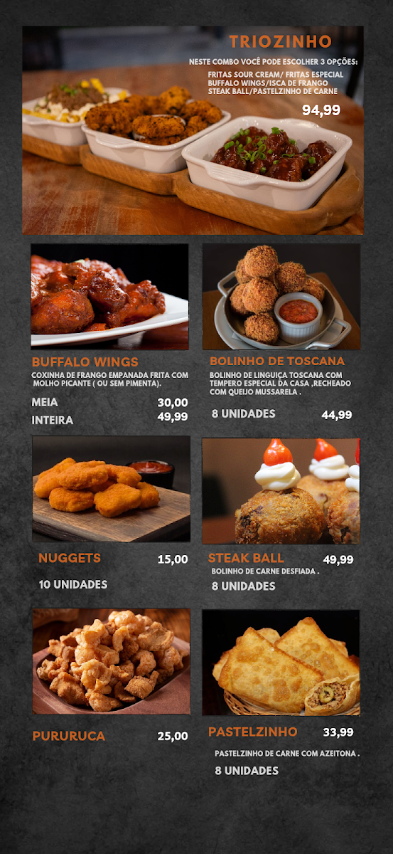 10 mini burger ( 2 na brasa / 2 costela / 2 cheeseburger/ 2 mussarela / 2 onion) Batata frita Bolinha de queijo Nuggets 1 Guaraná 2l